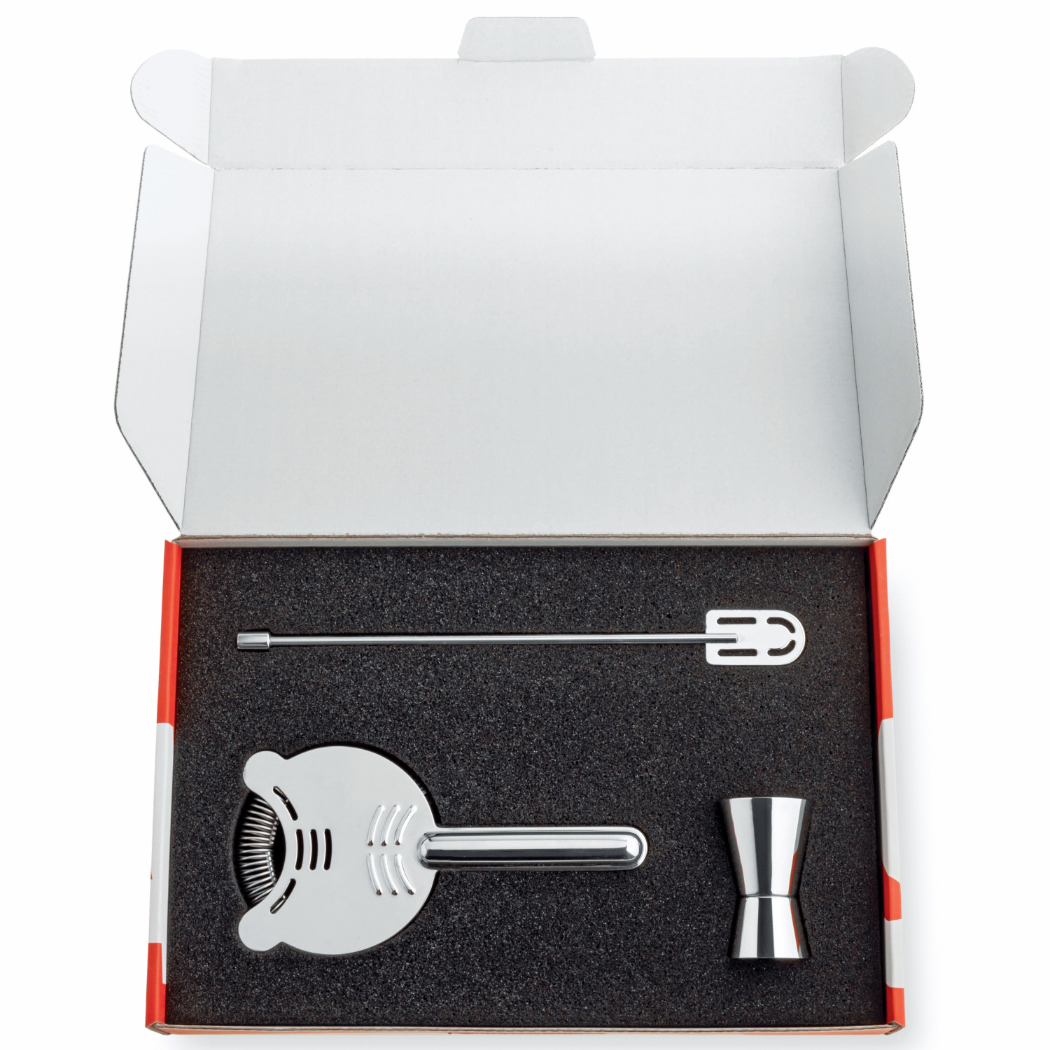 Set composed of: bar strainer, stirrer and cocktail measure in 18/10 stainless steel.